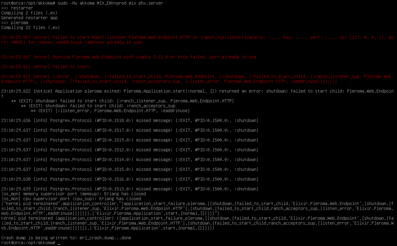 Everything else is installed and nginx is working; I left the IP and port default because that’s what the guide says to do when using the default nginx config but upon running sudo -Hu akkoma MIX_ENV=prod mix phx.server the process crashes after a few seconds and gives the following error output.