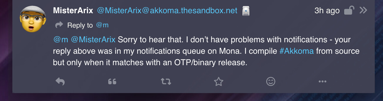 Interesting! I’ve tried it both ways, OTP release to get started, but now I’m compiling my own. Neither has worked for Metatext notifications. But I wonder if this points to some config. Actually … are we all running Akkoma behind nginx like the setup guides demonstrate, and could that have anything to do with it?