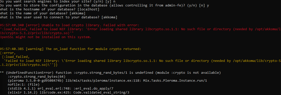 ":load_failed, Failed to load NIF library: 'Error loading shared library libcrypto.so.1.1: No such file or directory (needed by /opt/akkoma/lib/crypto-5.1.2/priv/lib/crypto.so)'"
